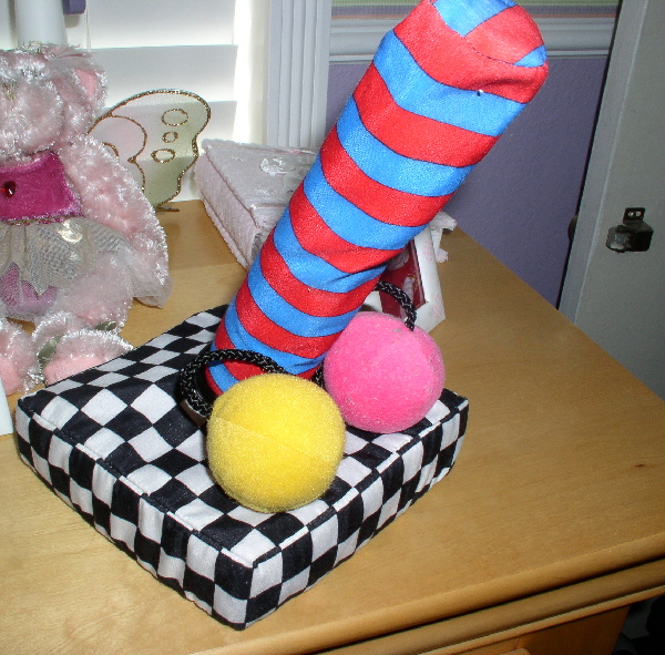 Oh, but it’s missing something. But what’s that over there? A set of BALLS? Oh, but there’s THREE of ’em? NO PROBLEM! Where there’s a pair of scissors, there’s a way.