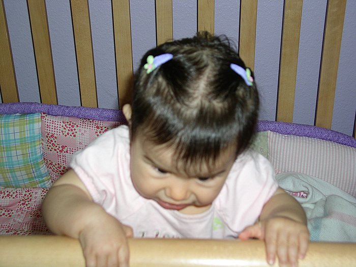 She was standing in her crib, I was standing facing her, with no shirt on, just a bra. A nursing bra. A nursing bra with snaps in the front.
