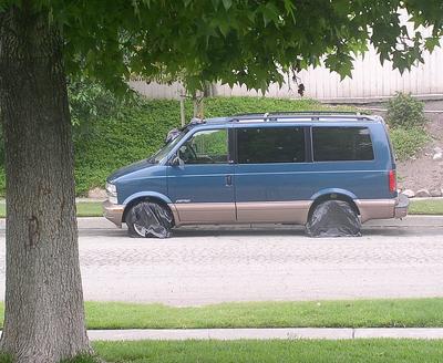 It’s just like my van! Only, with a broken windshield! And trash bags on the tires! And probably the getaway car in a serious crime!