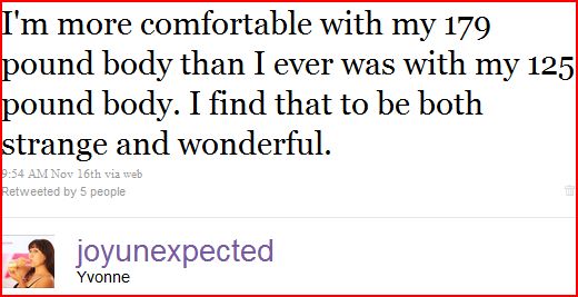 “I chose to stop believing the lies I would tell myself (you’re ugly. You’re repulsive. You don’t deserve to enjoy your life) I chose to stop measuring my worth on the stupid numbers on a stupid scale. I made a choice to believe and trust the people in my life who love and care about me.”